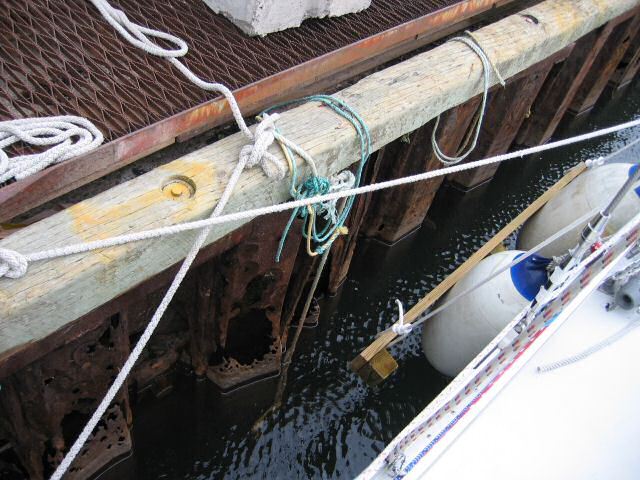We finally managed to get tied up as securely as we could. The yellow line in the picture below on the left is a polypropylene line tied to a cinder block inside the building (which Ken discovered on his exploration of the building). We hoped the block wouldn't pull through the side of the building. The metal pier had big gaping holes and there was lots of ugly, sharp metal along the length of the pier. We had two fender boards and about 10 fenders out to protect the boat. Fortunately we came through our two nights just fine.