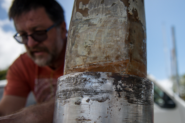 We think the weight of the dinghy hanging from the top of the mast, and probably bouncing around a little because we didn't have it strapped in well enough, eventually opened the welds used to make the taper.